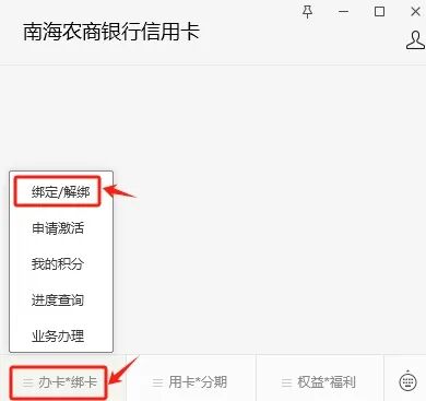 第一步:客户在“南海农商银行信用卡”官方微信公众号,通过菜单栏“办卡*绑卡—绑定/解绑”绑定名下信用卡