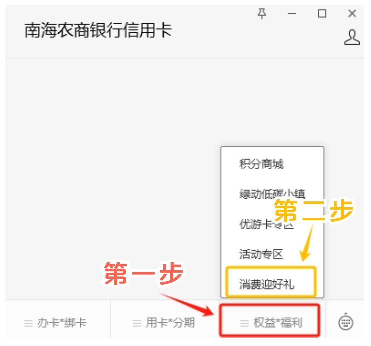 关注“南海农商银行信用卡”官方微信公众号,通过菜单栏“权益*福利—消费迎好礼”进入活动页面。