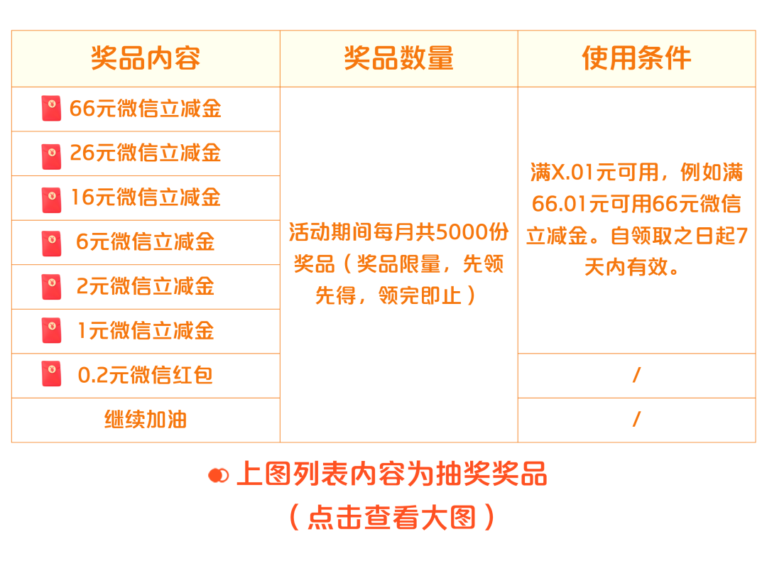 活动期间,客户使用南海农商银行信用卡支付,单笔消费金额≥10元,成功支付后可至指定活动页面参与抽奖,有机会领取最高66元微信立减金。同一客户最高可获得1次/天抽奖机会。抽奖资格仅达标当天有效。