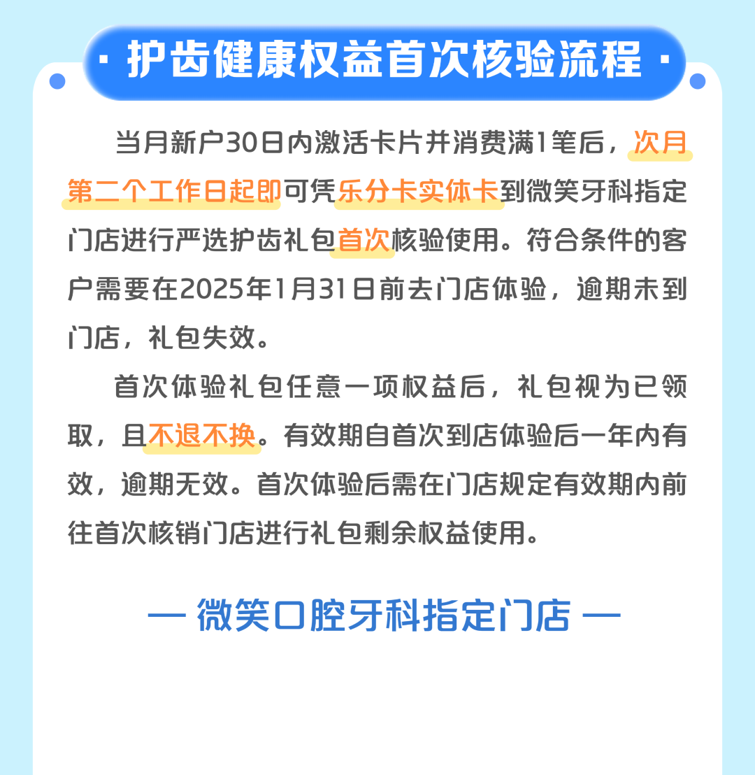 3.乐分新户开卡礼-严选护齿礼包首次到店体验的有效期为2025年1月31日。逾期未到店领取体验任一权益内容,礼包权益失效。