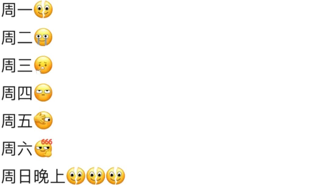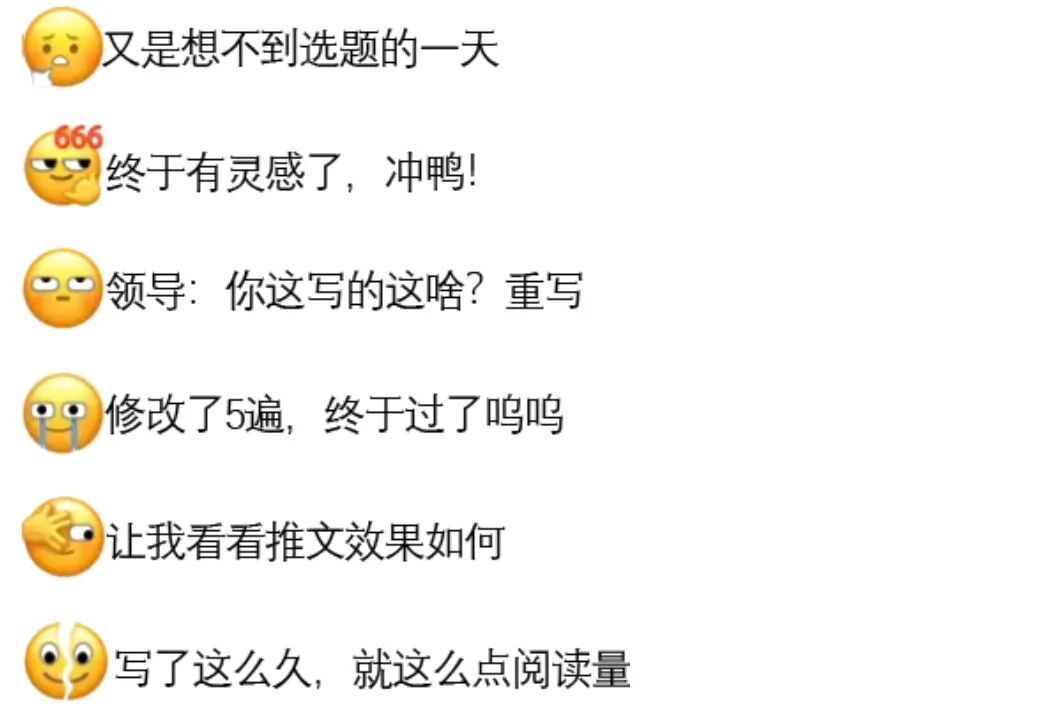 前一阵子,微信更新的6个新表情被网友们玩出各种花样,甚至有人巧妙的用这6个表情来表达打工人一周的心情。