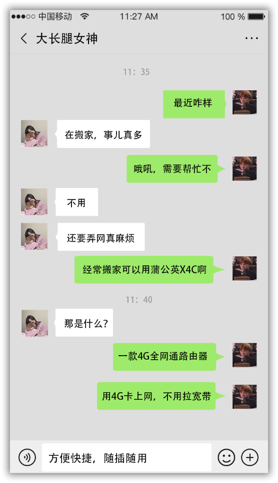 妹子听后表示,用X4C不用重新拉宽带的确很方便,因为她工作需要经常更换住所,就立即让我帮她下单买了一个。