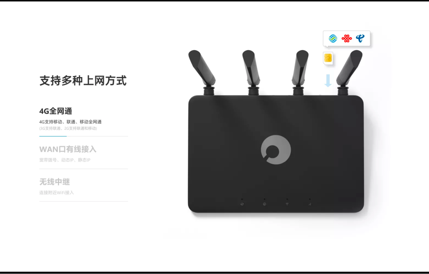 X4C采用有线接入、4G上网和无线中继三种上网方式:有线接入有宽带拨号、静态IP、动态IP;无线中继能够连接附近wifi接入。