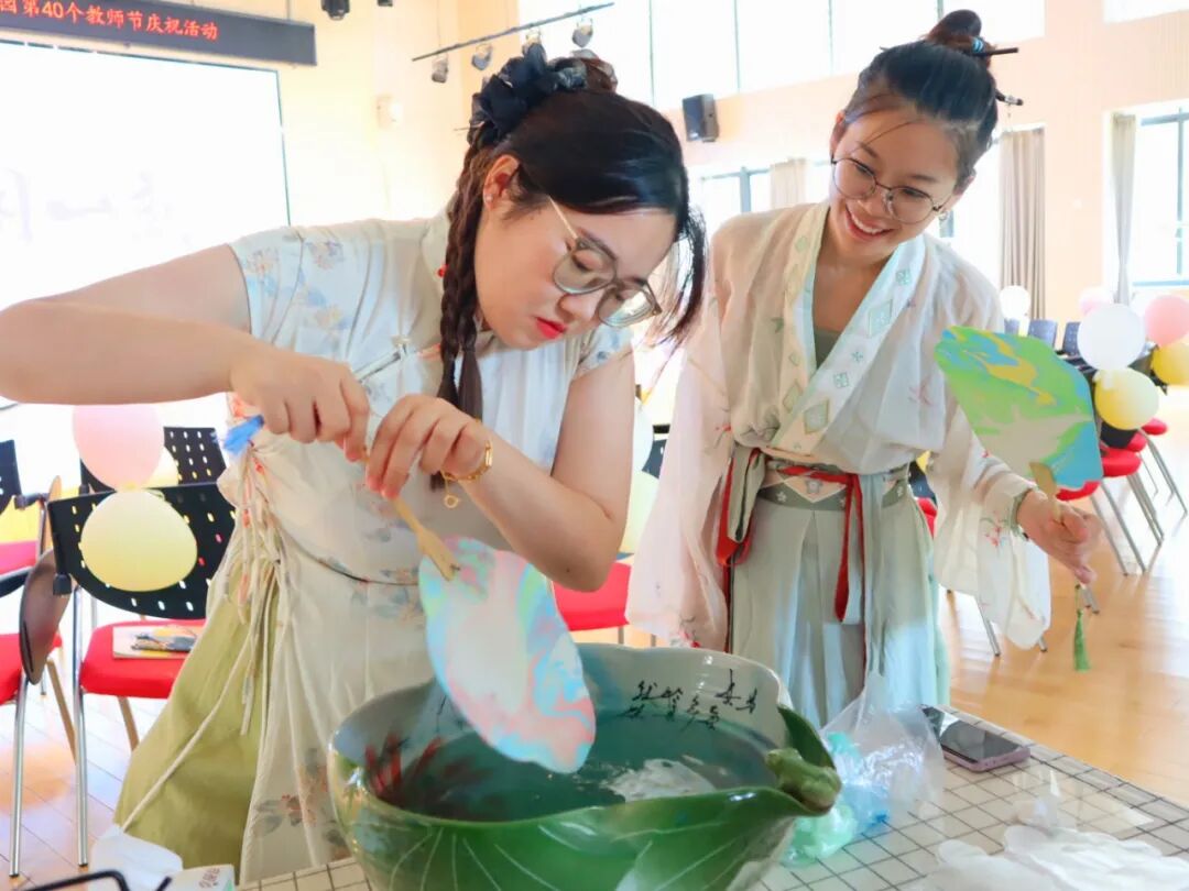 生活不止眼前的忙碌,更有诗和远方。苏州浒墅关实验幼儿园教育集团开展了一系列丰富多彩的庆祝活动。老师们笔触细腻,每一面海报、每一把团扇都蕴含独特心意。灯光璀璨的舞台上,老师们一起舞动,跳出四射活力。
