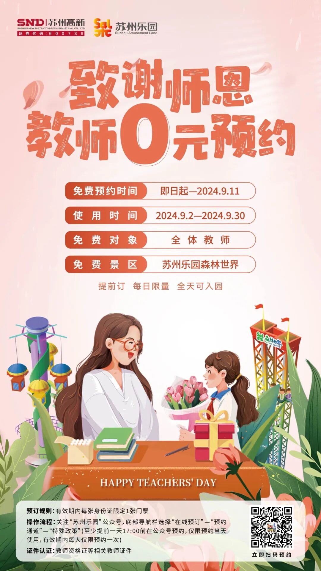 至少提前一天17:00前在苏州乐园公众号预约,底部导航栏选择“在线预订”“预约通道”“特殊免票”,预约时填写本人姓名、身份证号、以及手机号,并上传本人有效教师证件,等待景区审核,审核状态见底部“我的”“我的卡券”。