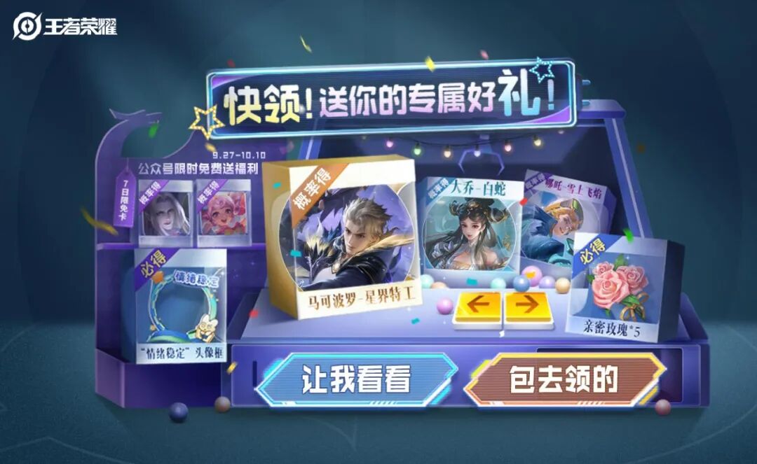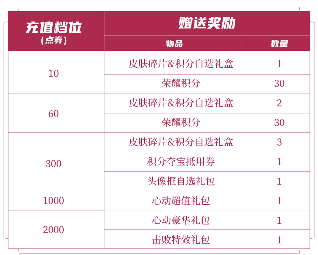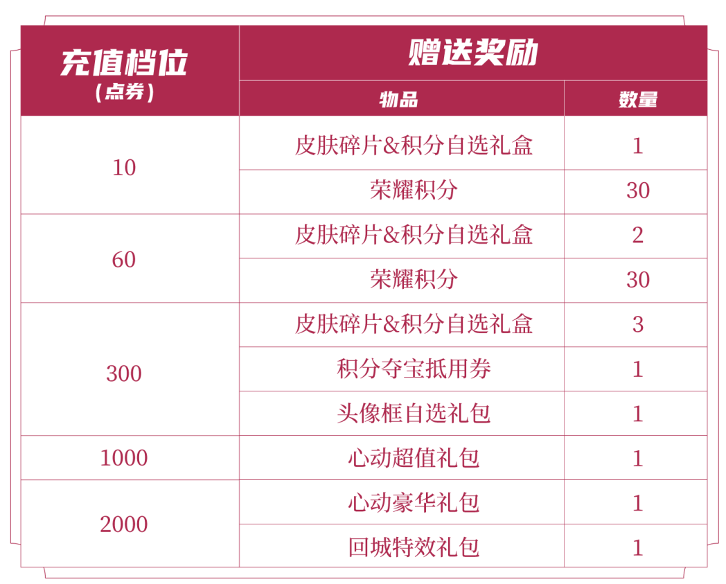 ♢ 皮肤碎片&积分自选礼盒:打开礼包可任意选择以下奖励之一:荣耀积分*10或皮肤碎片*1