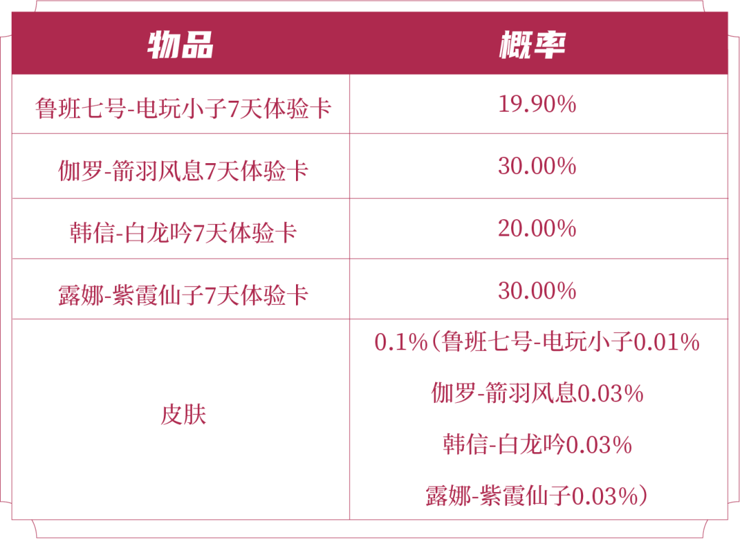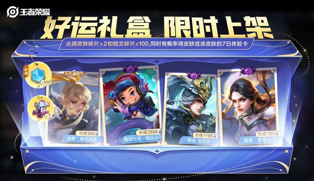 打开后必得皮肤碎片x2、铭文碎片x100和以下随机奖励之一:皮肤或皮肤体验卡(7日)1张(鲁班七号-电玩小子、伽罗-箭羽风息、韩信-白龙吟、露娜-紫霞仙子)