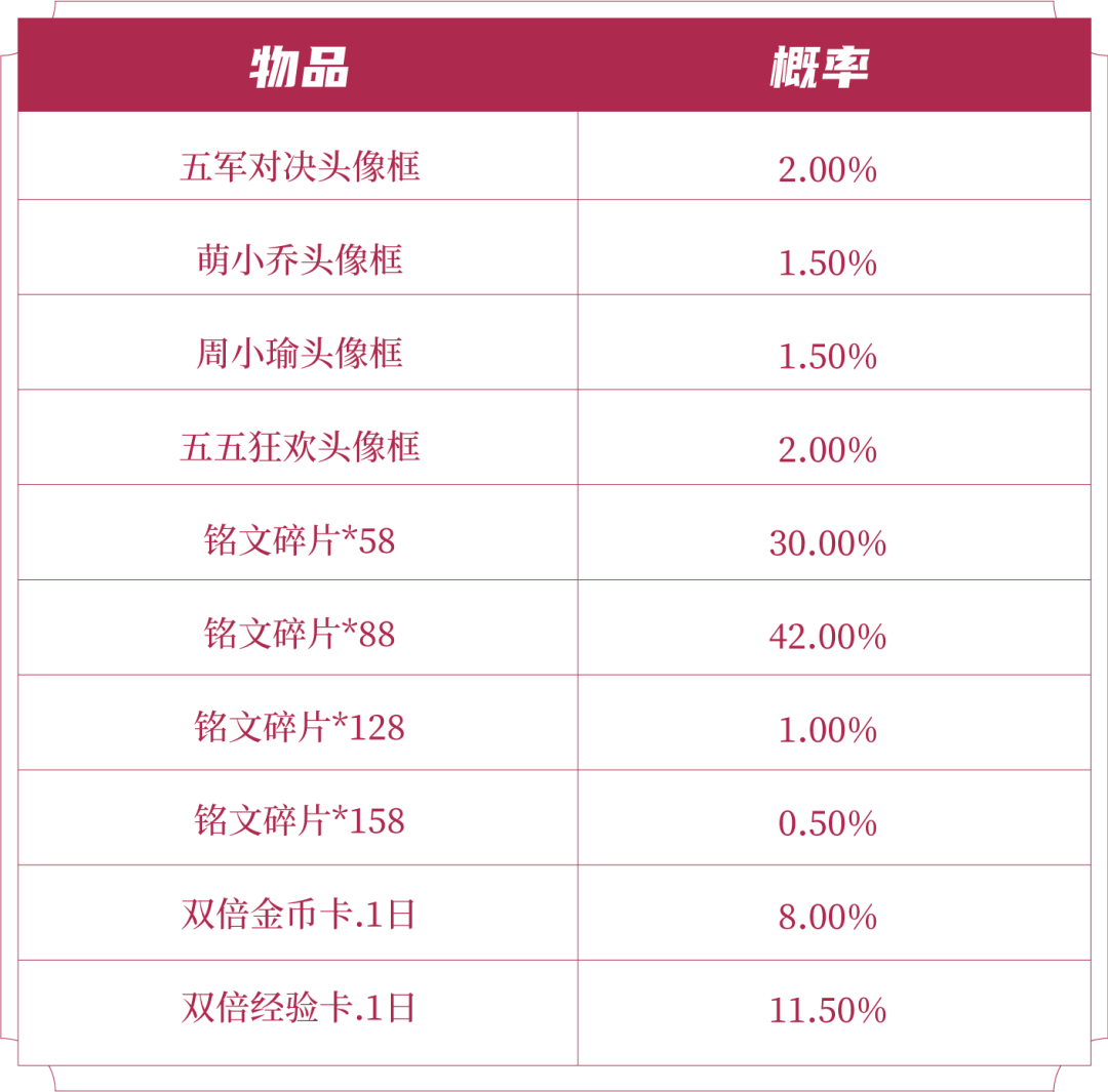 打开后可随机获得以下奖励之一:五军对决头像框、萌小乔、周小瑜、五五狂欢头像框、双倍金币卡:1日、双倍经验卡:1日、铭文碎片x158/128/88/58。