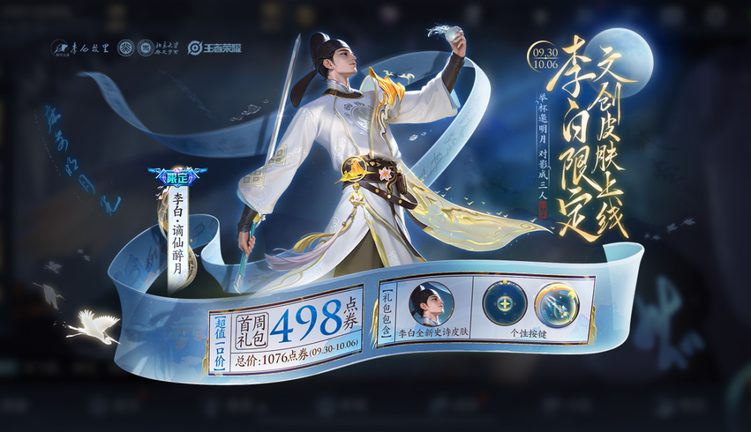 ♢ 谪仙醉月礼包:打开后可获取皮肤特权红包礼包(红包10月9日23:59过期),李白周边商城礼包x1。