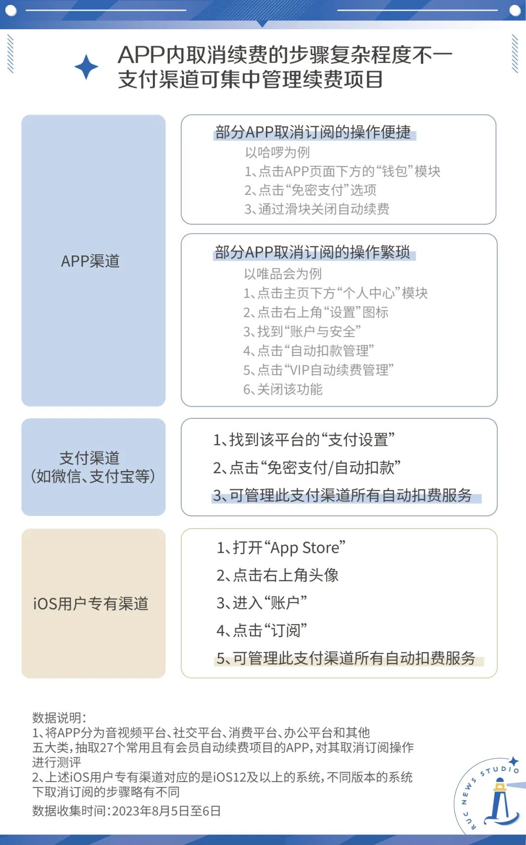 一般而言,用户可以通过APP站内设置、微信支付宝等支付渠道以及iOS账号订阅等途径管理自动续费服务。如果选择站内设置,则用户平均需要点击4.5次才能取消一个续费服务。而管理续费服务的页面也往往“隐藏”颇深,不跟着条款中的指示路径操作很难找到。