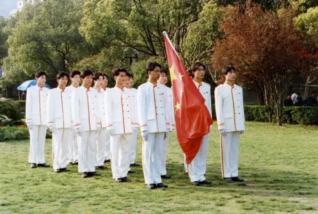 同年5月12日,中国政府对香港恢复行使主权倒计时50天,全省近十万学子国旗下喜盼香港回归。那一天,《钱江晚报》头版这样记载:“上午7时,在活动的主会场、浙江大学校园内,2000多名大学生齐聚在五星红旗下……参加了升旗仪式。”承担升旗任务的,就是刚刚成立不久的国旗班。