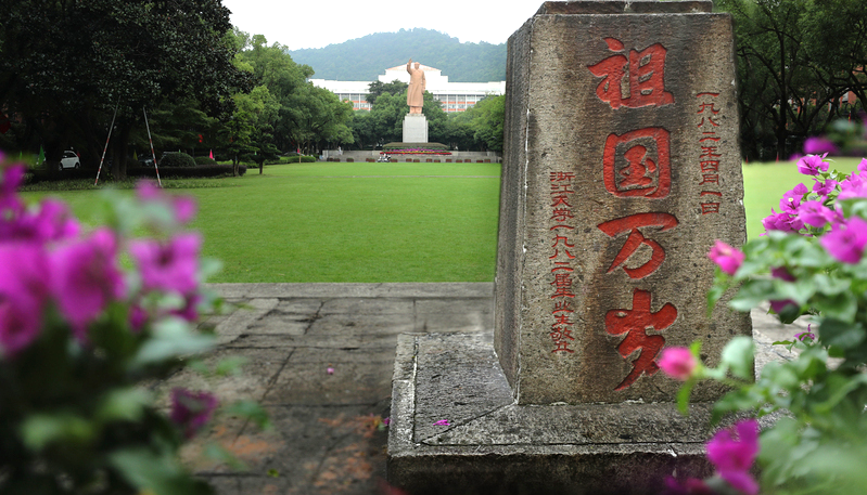 玉泉校区的中轴线上,草坪东侧竖立着一根旗杆,旗杆基座上刻着苍劲有力的四个字——