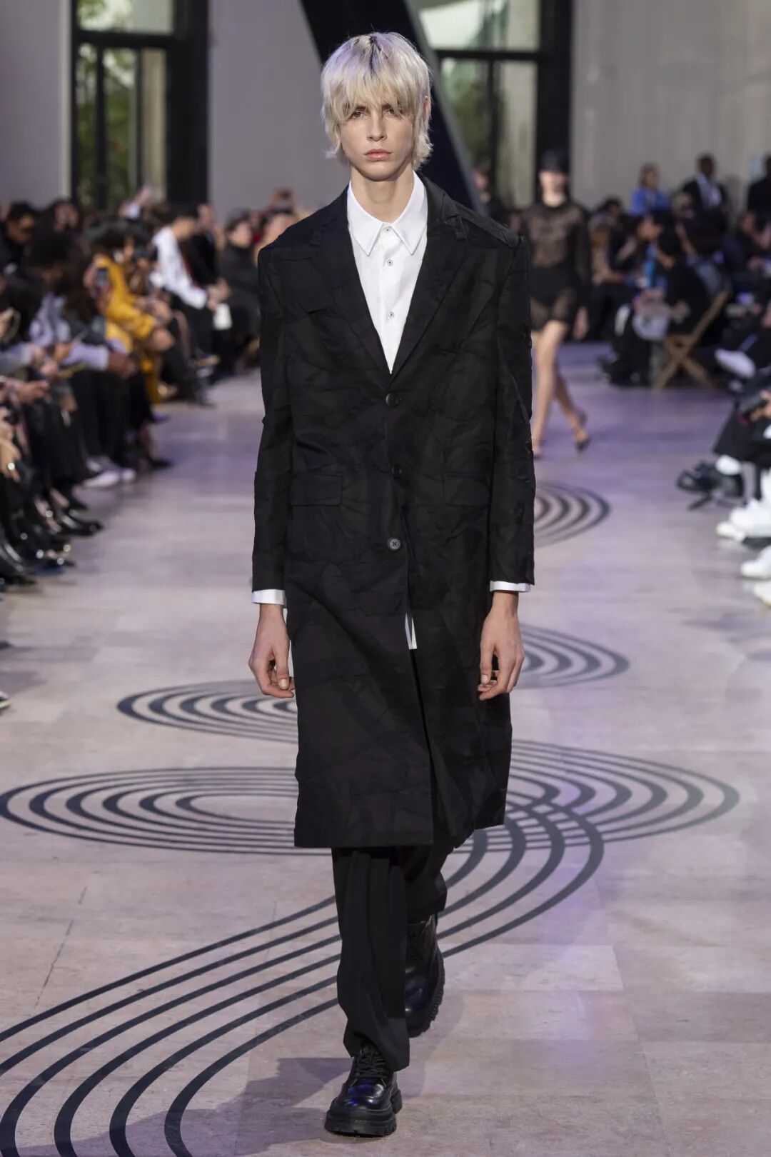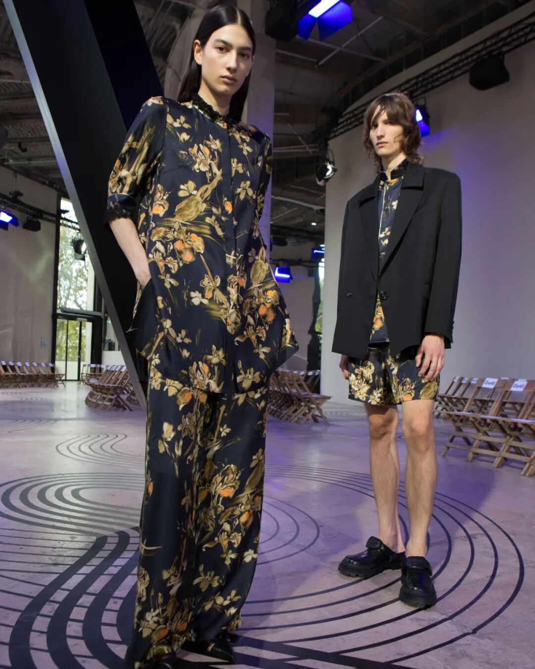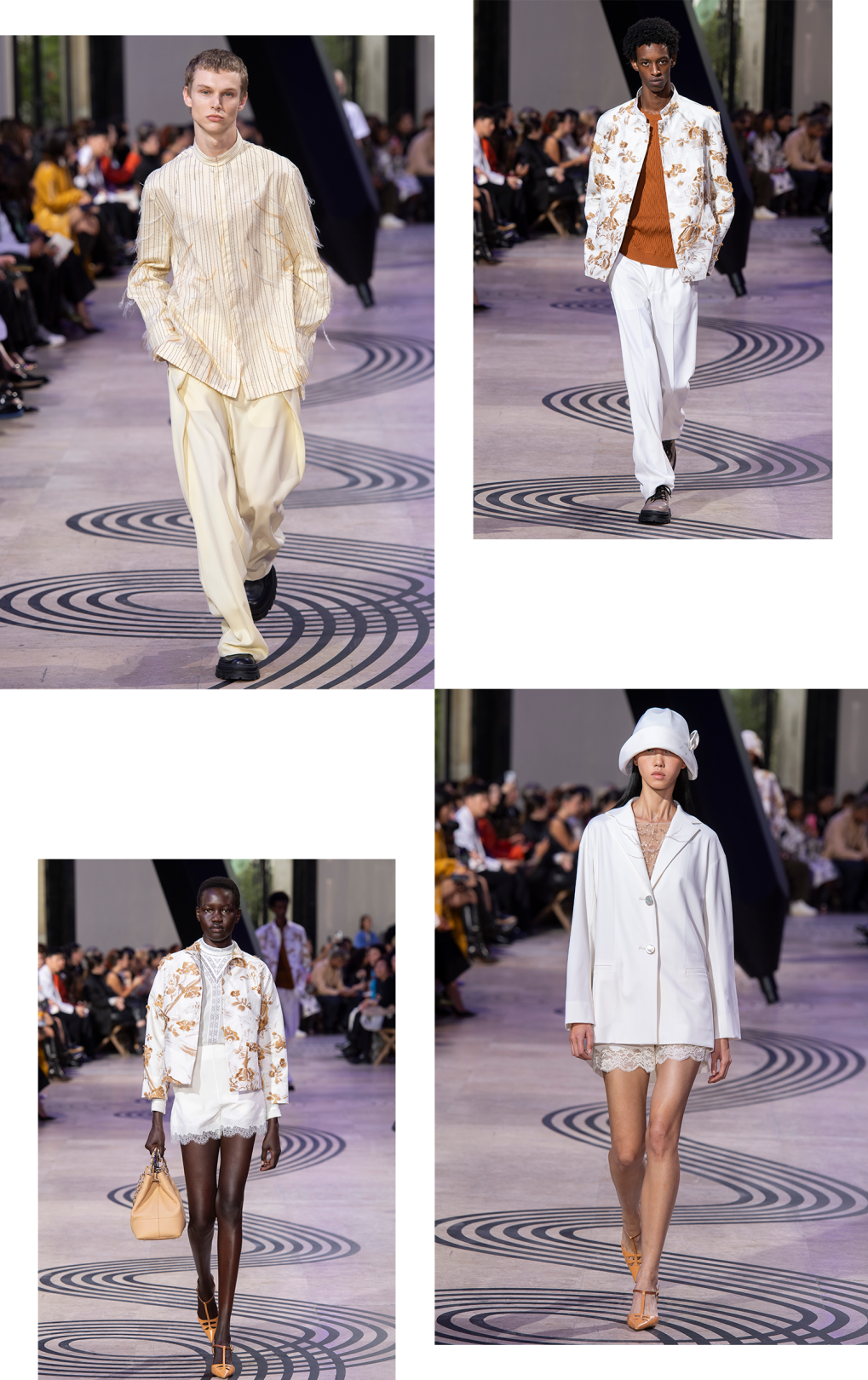 薄纱与流苏、羽毛与亮片缀饰则如同贯穿其中的灵巧笔触,以浓淡对比之姿,构建出水墨的气韵。男装与女装采用的大量异种素材、轻量毛料、漆面,表达着毛笔飞舞柔绘的潇洒与素描细腻入微的笔触。