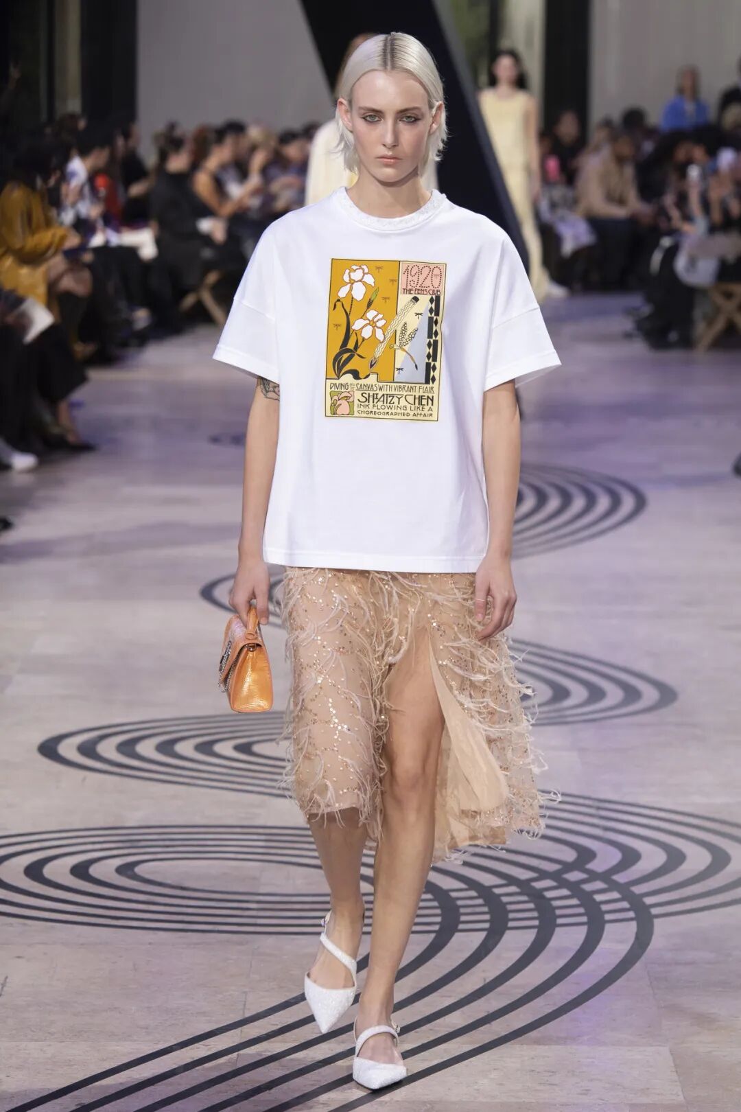 以「笔」为原点,开场模特从秀道上如舞的线条中款款而来,在墨色的虚实之间,装饰艺术(Art Deco)风格的鸢尾花、蜻蜓图案与色块、T恤裙刻意放低的下摆便带我们重回20年代的欢乐与自由。Art Deco的复古绘画与20年代经典的裁剪风格仿佛一个隐喻,暗暗显示出整场大秀自然、轻盈、优雅又飘逸的氛围,工艺、新材料与现代主义风格的融合,以及,一种关于未来的信心。