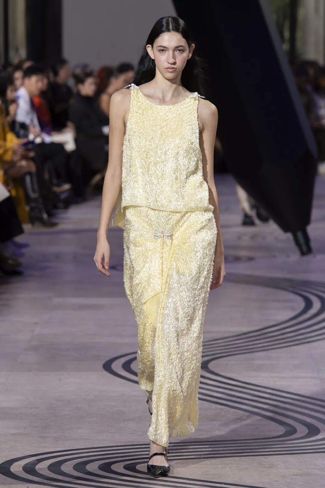 步入位于巴黎知名当代艺术中心东京宫(Palais de Tokyo)的SHIATZY CHEN秀场,巨大的水墨之笔装置映入眼帘。落笔于此,墨痕游走于秀场中央,在交叠变幻中勾勒出SHIATZY CHEN 夏姿・陈 2025 春夏系列时装大秀的序章。上季「墨沫」的东方意蕴渗透至新一季,水光墨色笔下生花,以东方书画节奏勾勒万象云烟,展现本季「点青」之采。