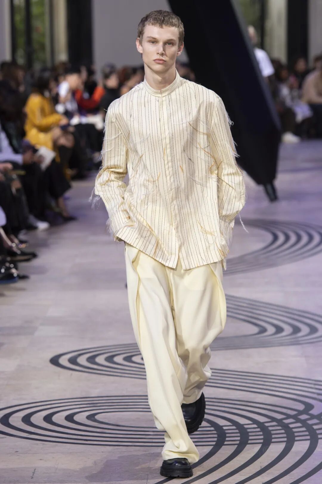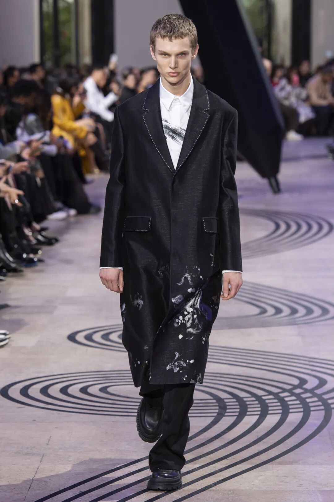 第四次出席大秀现场的品牌大使刘宇身着品牌2024春夏系列中一袭灰色毛呢外袍,领口的兰花装饰恰恰呼应着本场秀的主题,精致挺括的面料在宽松版型下亦有松弛感,完美呈现出国风美少年独有的东方书画节奏。