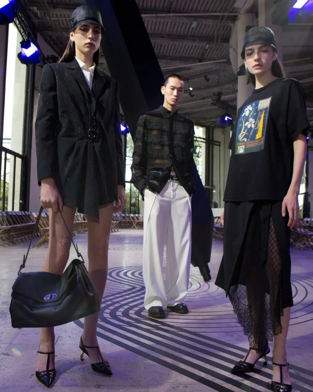落笔有时,挥毫有意。以墨色开场,让简洁利落的裁剪和西服套装版型、纱质材料与硬朗西装面料的拼接,或是带着品牌“S”标志项链、手提链饰包袋的酷飒女郎带着充满力量感的磅礴气势走来。
