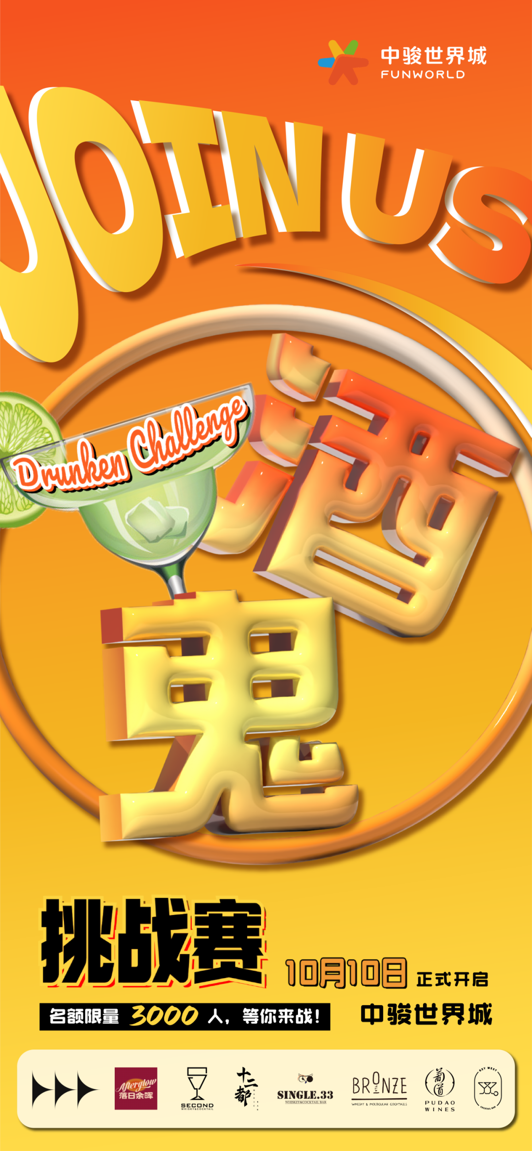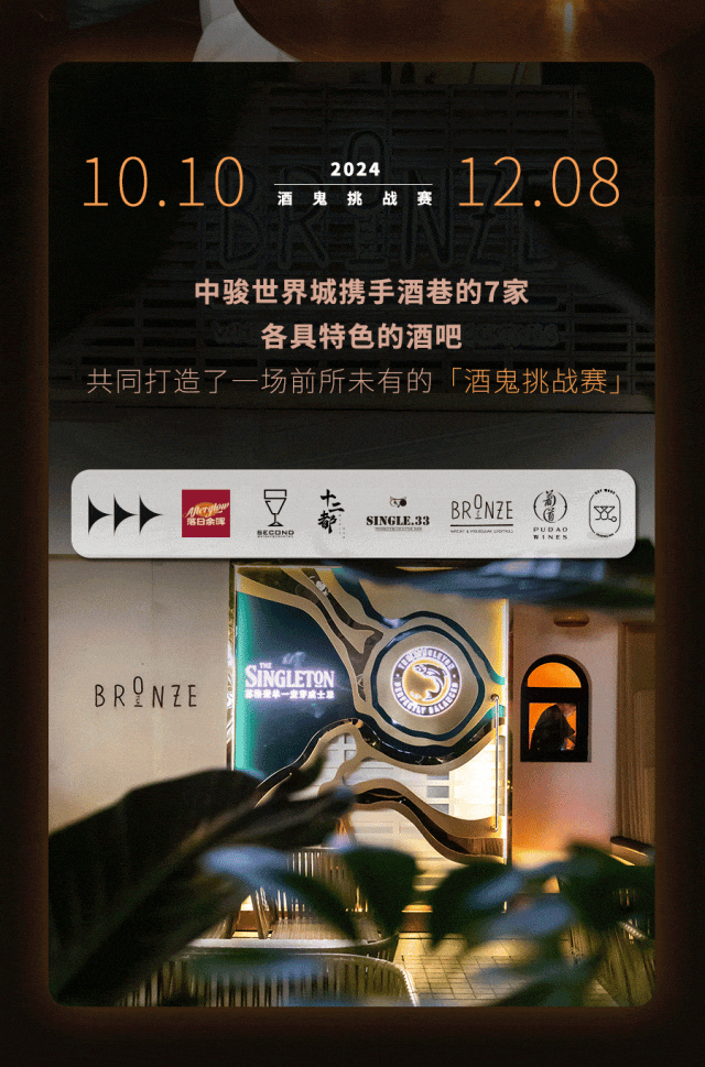 在挑战期内,只需购买168元早鸟票,你就能购买到一张酒鬼挑战卡,在中骏世界城酒巷的任意一家酒吧,发起这场关于味蕾与灵魂的双重冒险,开启这场充满未知与惊喜的旅程。