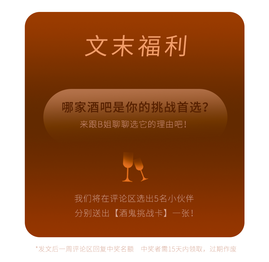对于成功挑战者来说,奖励也是十分丰厚的。每家酒吧的前100名挑战成功者将获得酒吧提供的6杯免费鸡尾酒,一共700名成功者名额!