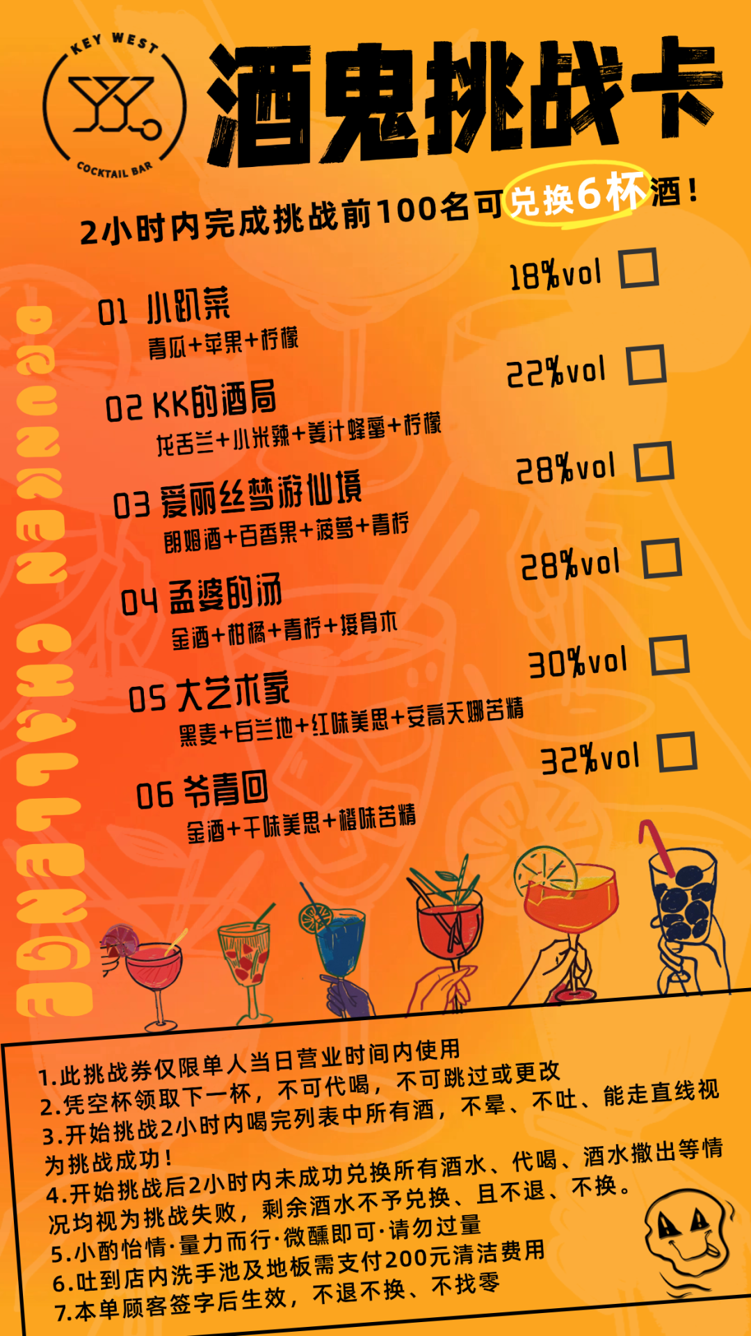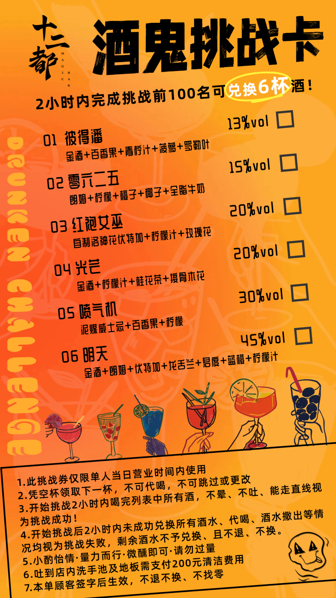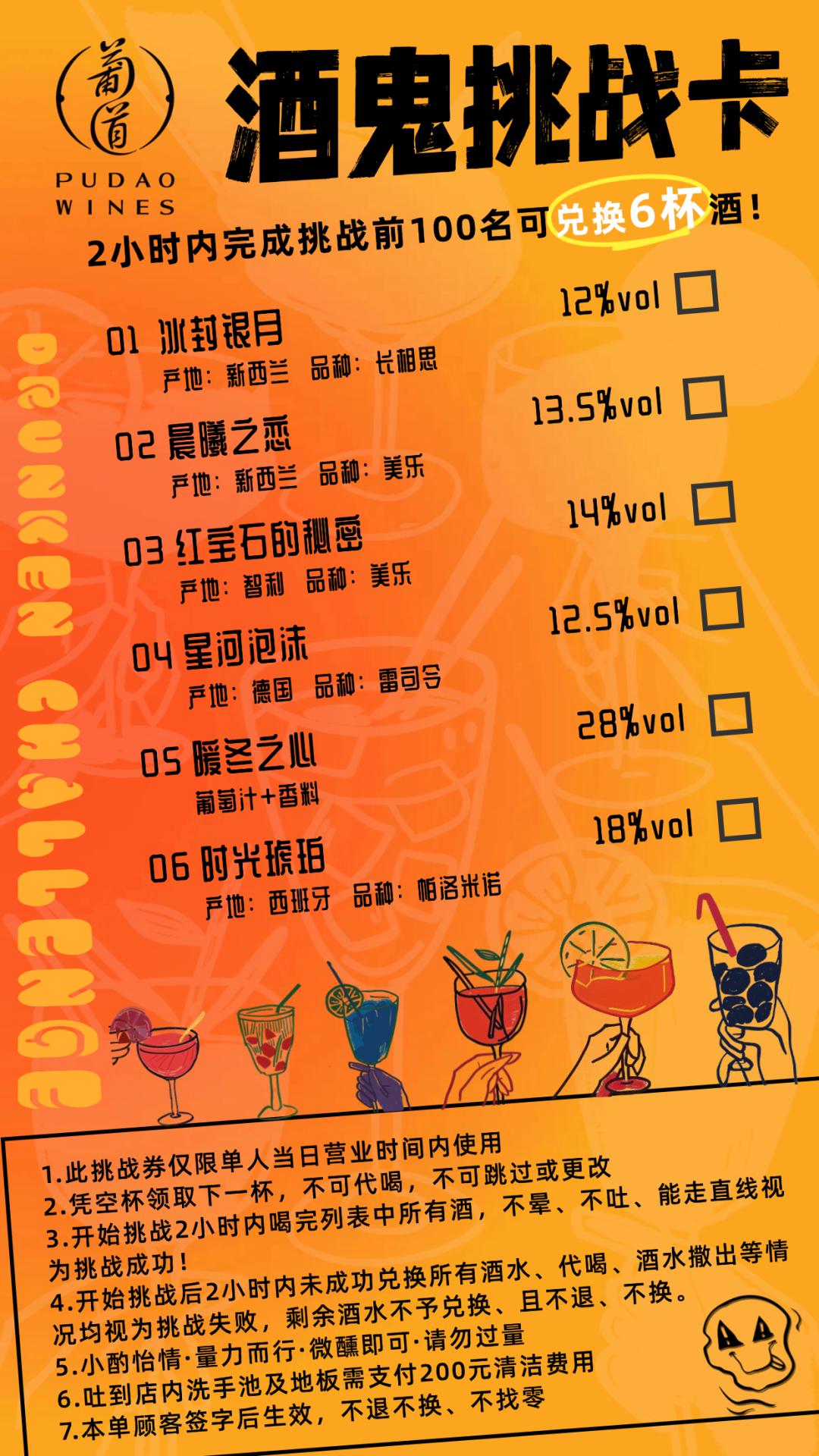 挑战规则简单而明确:你需要在2小时内,凭借空杯领取下一杯,不可代喝,不可跳过或更改,喝完列表中所有酒,不晕、不吐、能走直线,才算挑战成功。