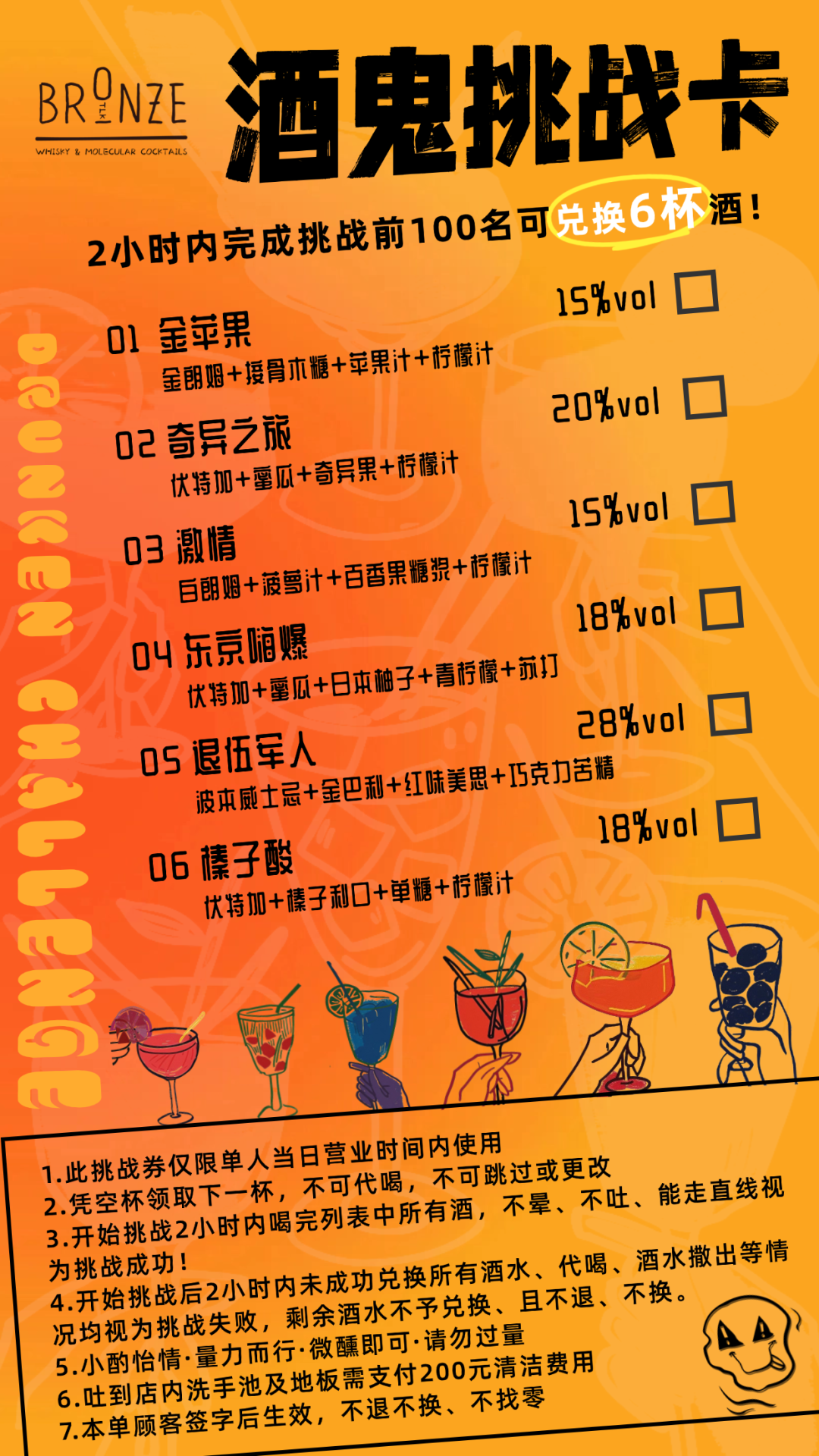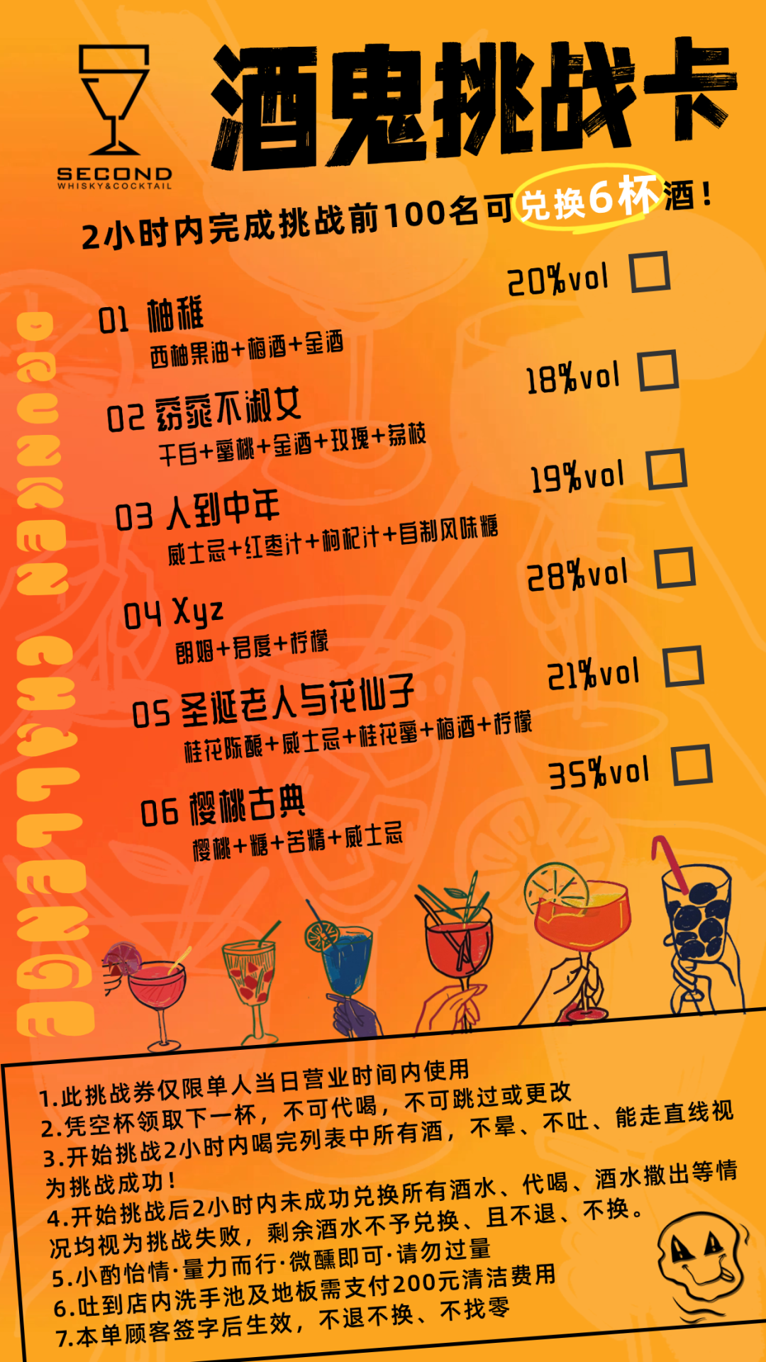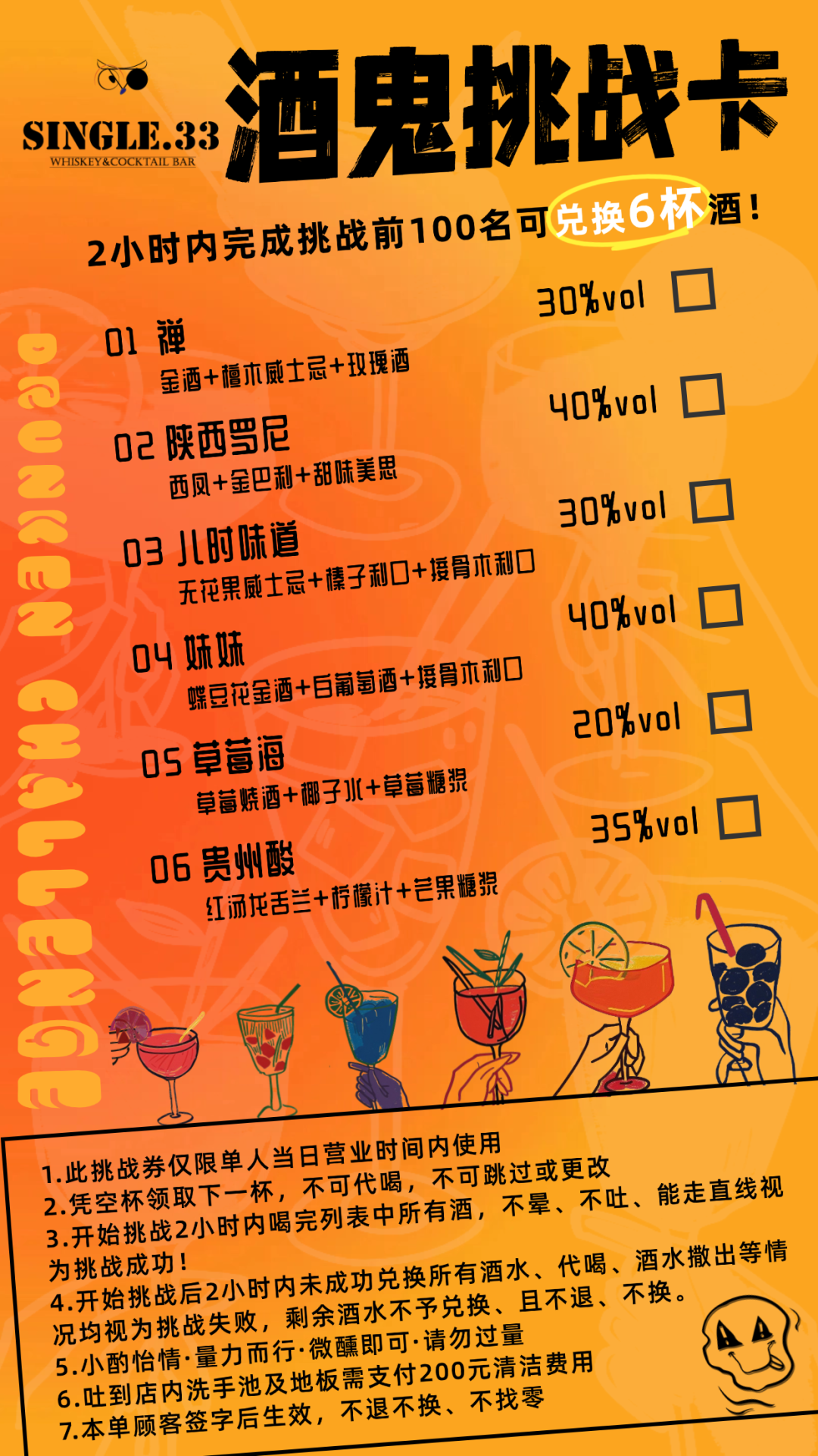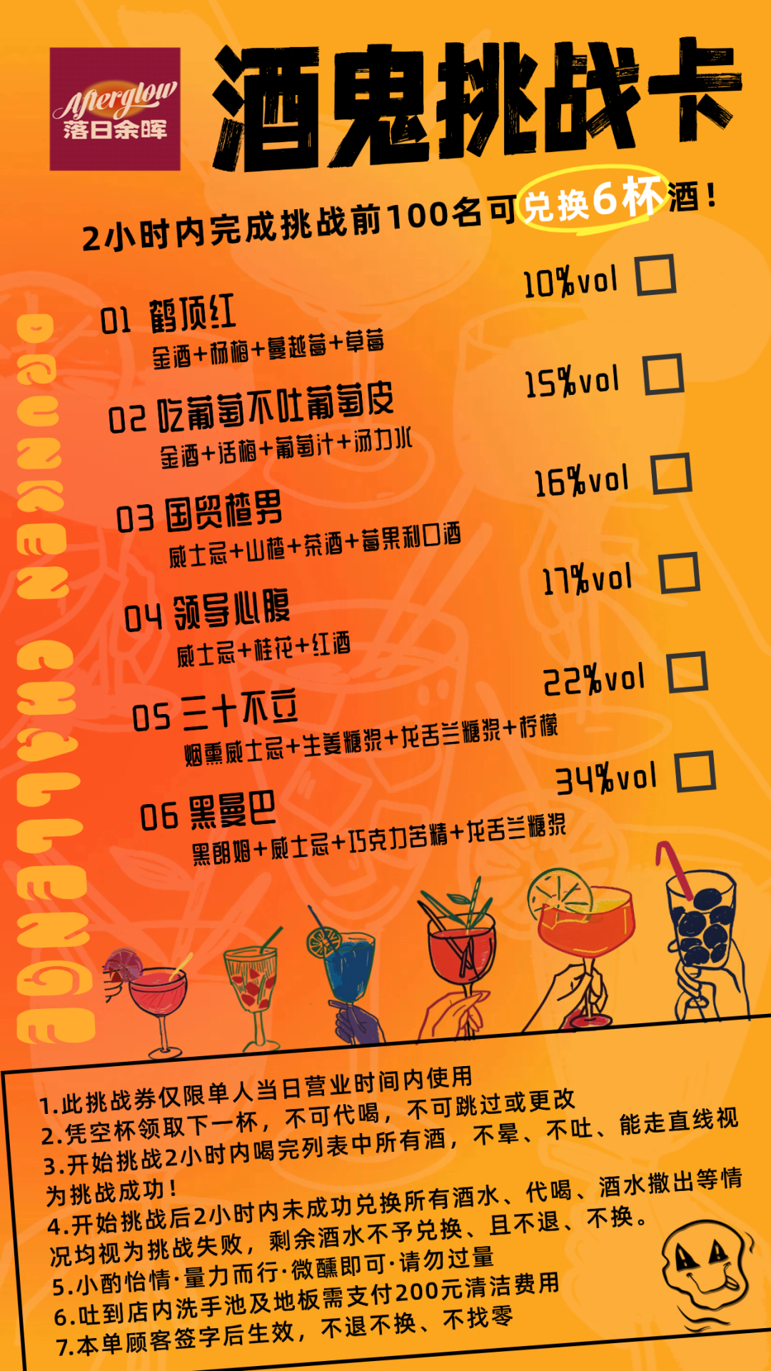 挑战规则简单而明确:你需要在2小时内,凭借空杯领取下一杯,不可代喝,不可跳过或更改,喝完列表中所有酒,不晕、不吐、能走直线,才算挑战成功。