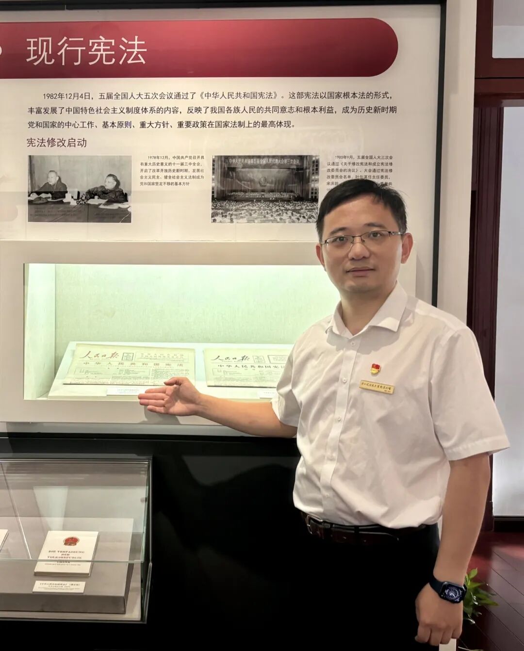 陈列馆二楼橱窗展陈了1982年12月5日的《人民日报》,刊登我国现行宪法全文,这是我的生日报,我和“八二宪法”一起成长,亲历了宪法的五次修改,忘不了赴外省辗转觅得史料档案的如获至宝,忘不了聆听亲历者回忆“五四宪法”通过时全民欢欣鼓舞的感人至深,忘不了2018年连夜赶工修改宪法宣誓墙的激动至极,更铭记下了作为宪法宣传教育者的职责使命,要不断弘扬宪法精神,为深化平安建设不断注入法治力量,让平安浙江更加行稳致远。