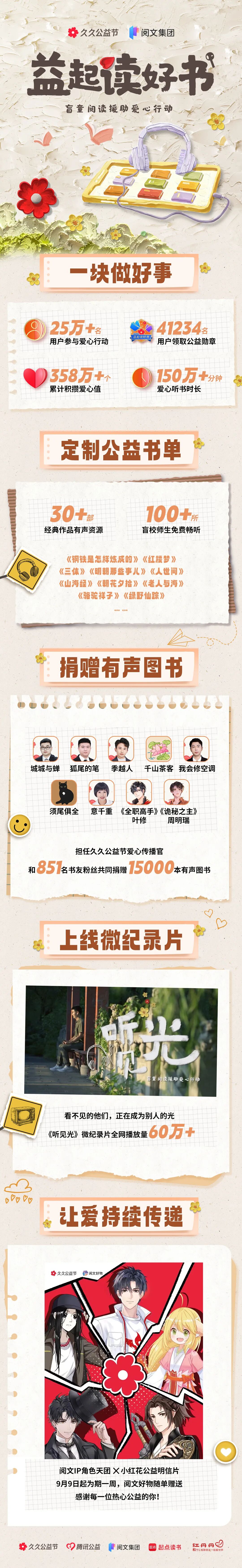 今年的久久公益节,阅文集团联合北京市红丹丹视障文化服务中心发起“益起读好书”盲童阅读援助爱心行动。超25万名用户参与爱心行动,为盲童筹集有声图书15000本。