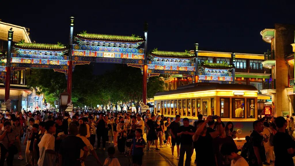 前门大街位于北京中轴线上,夜色比白昼更迷人。华灯初上,灯光笼罩之下,五牌楼变得更加鲜艳夺目。前门大街是中华老字号的聚集区,六必居酱园、同仁堂药店、都一处的烧卖馆等分列道路两侧,同时这里也是北京市重要的非遗沉浸式体验区。