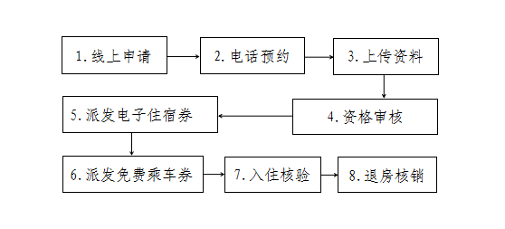 提交申请后1个工作日内完成免费住宿审批,免费住宿审批通过后的1个工作日内完成免费乘车券发放。