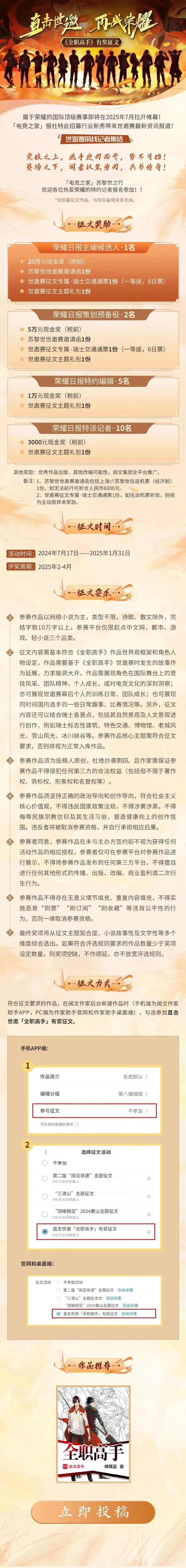 《全职高手》二创征文开启,「电竞之家」瑞士苏黎世之行,诚邀各位国内外热爱荣耀的特约记者报名参加!