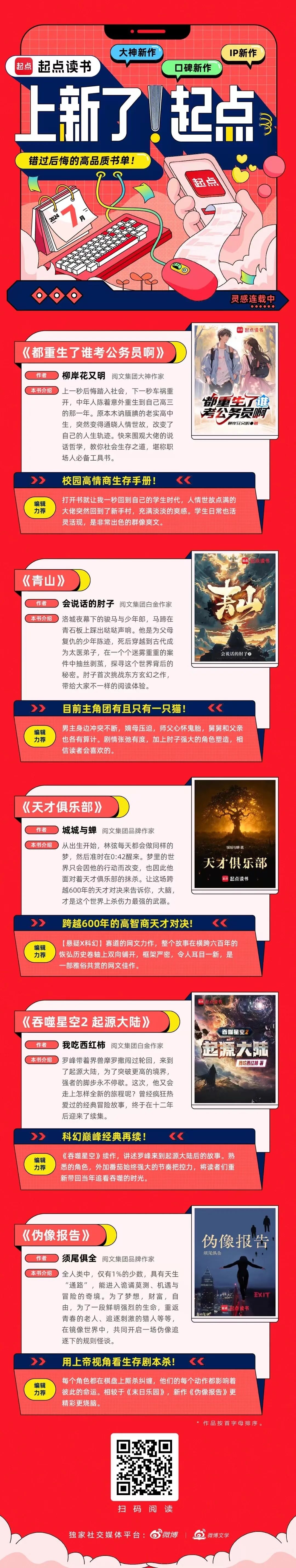 7月25日,“上新了!起点”首期书单上线:阅文作家我吃西红柿《吞噬星空2起源大陆》、会说话的肘子《青山》、柳岸花又明《都重生了谁考公务员啊》、城城与蝉《天才俱乐部》、须尾俱全《伪像报告》,5本口碑新作等你来看!
