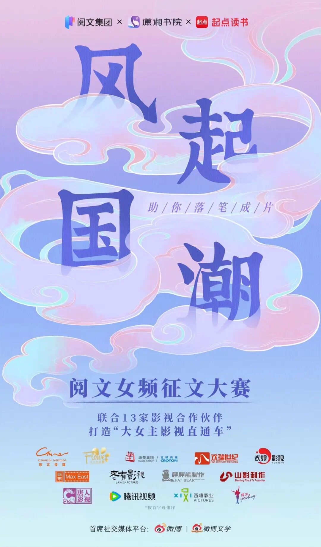 从文字开始,直通影视!7月23日,阅文集团携手13家影视合作伙伴,联合发起“风起国潮”女频征文,题材不限,6000字起投。