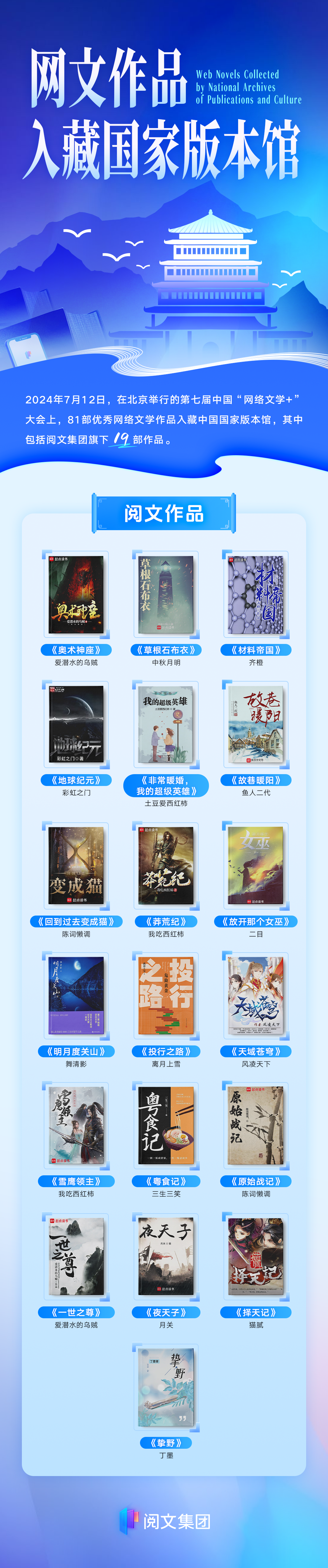 7月12日,第七届中国“网络文学+”大会上,19部阅文作品入藏国家版本馆。至此,阅文旗下作品入藏国家版本馆的数量增至76部。