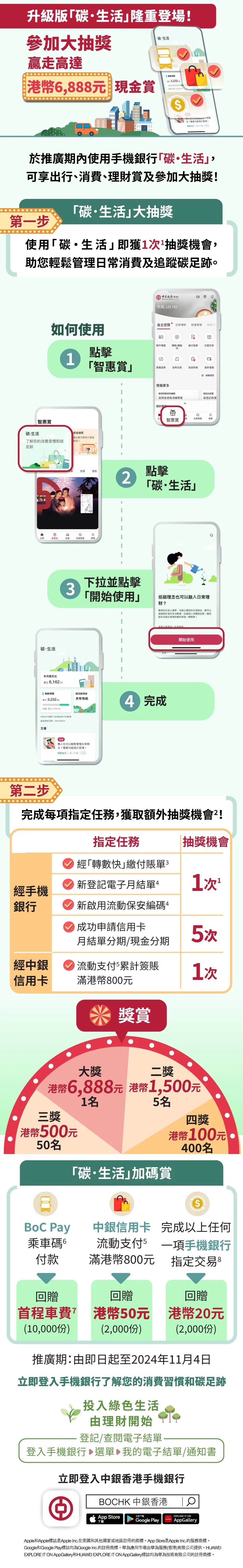 2.客戶於推廣期內經中銀香港手機銀行使用「碳.生活」(「合資格客戶」),可享「碳.生活」出行賞、消費賞及理財賞,並可參加「碳.生活」大抽獎贏取現金獎賞。