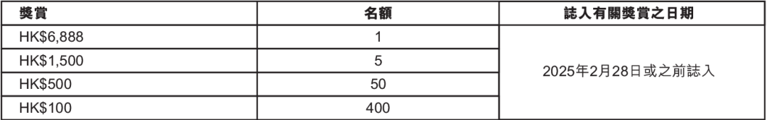 4.抽獎結果將在2025年2月28日或之前在中銀香港網頁www.bochk.com、最新版本的中銀香港手機銀行公佈,並按中銀香港紀錄的客戶電話號碼發送得獎通知短訊予獲獎客戶。