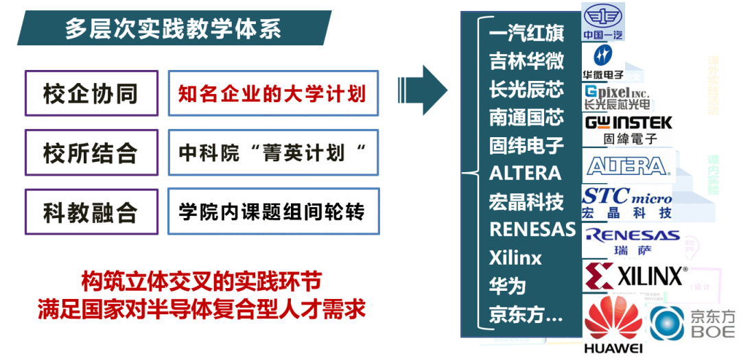 学院与中国科学院空间科学与应用研究中心(国家空间科学中心)、光电研究院、半导体研究所等国内6家科研院所,共同组建了中科院吉大协同育人“菁英班”科研教学实习基地;与一汽红旗、长光辰芯光电、TCL华星光电等数十家企业公司合作,建立了稳固的共建实习实践基地。与瑞萨电子(中国)有限公司、ALTERA公司、Xilinx公司、固纬电子、宏晶科技有限公司等知名企业联合共建吉林大学——瑞萨MCU联合实验室、吉林大学——Xilinx公司FPGA创新实验室在内的5个校企联合实验室。