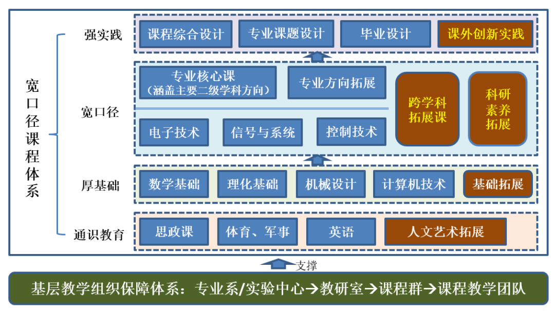 通过多学科融合,构建支撑宽口径人才培养的课程群。根据专业复合型人才培养需要,依照“宽口径、厚基础、强实践、重创新”的教学理念,精心设计专业核心知识能力素养组成和拓展方向,开设相应课程群,涉及数学、物理、化学、机械、计算机、电子、控制以及专业学科领域各二级学科方向主干课程,在培养方案中增加学科拓展课模块。充分利用学科的科研资源优势,为本科生提供专业创新实践教学体系。