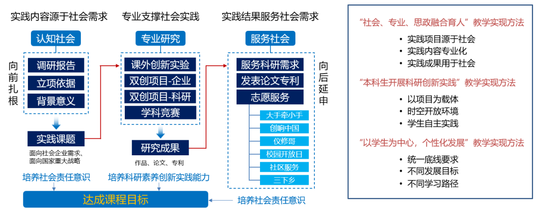 构建贯穿大学四年、层次递进的课外实践教学体系。实践内容包括调研报告、课外创新实验、创新创业训练、学科竞赛、论文专利发表、志愿服务六大模块,增强学生分析问题、解决问题和学术交流能力。通过专业实践内容“向前扎根、向后延伸”的方式培养学生社会责任意识。