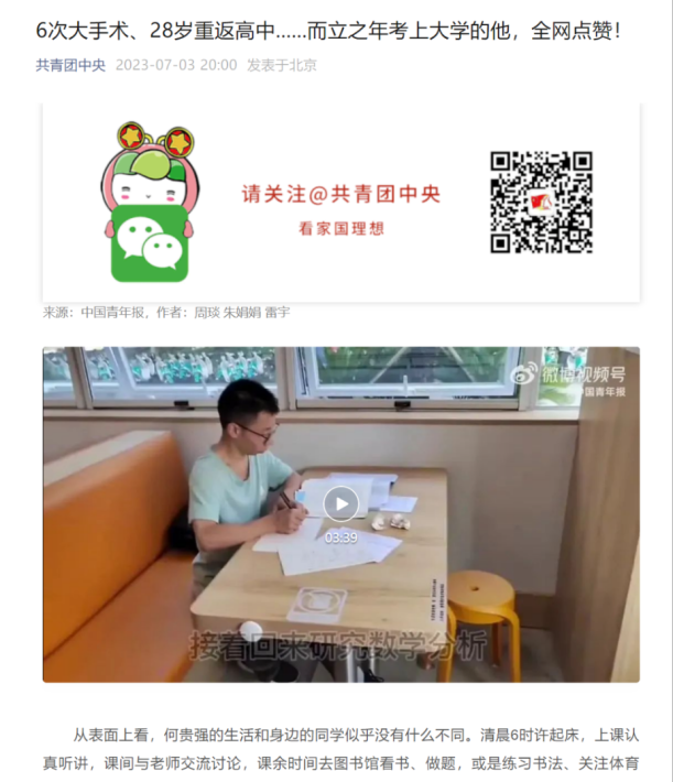 随着国家精准扶贫的好政策,在脱贫攻坚期间,医疗保险报销比例提高,让何贵强一家看到了希望。经过多次手术和康复训练,他终于站了起来。“面对身体的缺陷,唯有依靠知识来扭转命运。”2020年,他决定重返校园复读高三,当时已28岁的他刻苦学习,从班级倒数考进年级前20名。
