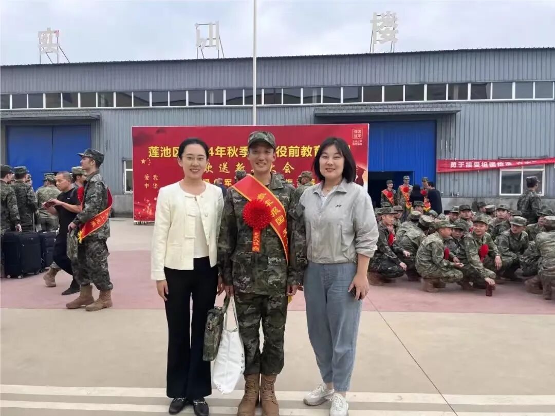 9月18日,学校在役前教育集训基地举行2024年秋季大学生入伍欢送仪式,学院党委副书记佘丹丹、团委书记史文佳参加欢送仪式。2020级土木工程专业许贤同学身着戎装、肩披绶带、胸戴红花,怀揣着老师和家人的深情嘱托和殷切希望,即将奔赴军营,踏上人生新征程。佘书记为入伍学生佩戴绶带,赠送纪念品。她向即将踏上光荣征程的新兵提出殷切期望:希望新兵能够坚定信念、脚踏实地,听从党的指挥,服从部队管理,刻苦训练,把青春和热血奉献给祖国,努力做“有灵魂、有本事、有血性、有品德”的新时代人民好战士,为实现祖国强军梦贡献青春力量。携笔从戎赴军营,建工学子卫国情。祝愿入伍的新兵们都能创造属于自己的辉煌,将来为军队发展、国防建设贡献自己的青春力量。