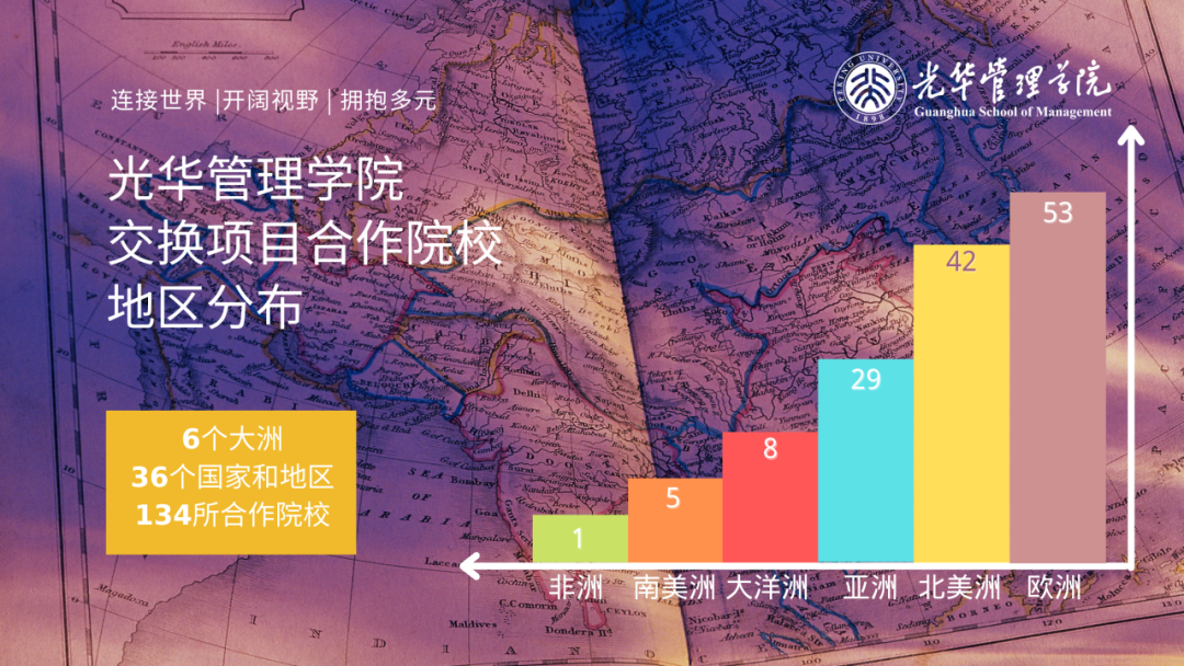 经过近四十年的发展,光华管理学院广泛开展国际合作,与百余所世界知名院校建立合作关系,并不断扩大学院在国际上的影响力。截至到2024年9月,与光华签订学生交换协议的院校达到134所,分布在北美洲、大洋洲、非洲、南美洲、欧洲、亚洲的36个国家与地区,为各个学位项目的学生提供丰富的海外学习和交流机会。