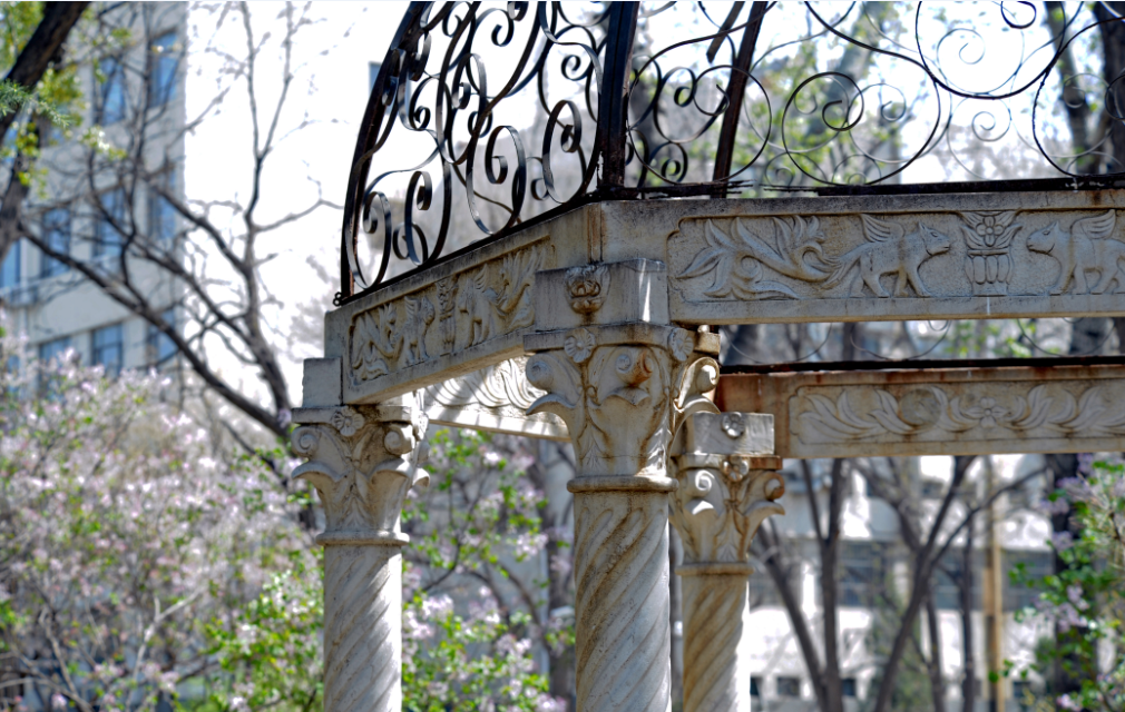 骥亭位于第一教学楼、第二教学楼和材料楼围绕的小花园中。2000年8月,在北工大40周年校庆之际,北工大校友会石家庄校友分会将此亭赠送母校。铁栏古韵,这里是北工大学子的秘密花园。骥亭的周围还有许多丁香,慵懒的午后,暖阳相伴,在斑驳的树影下,醉了无数路过的行人。