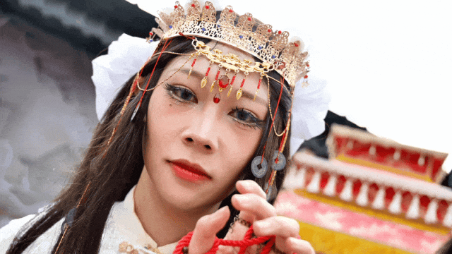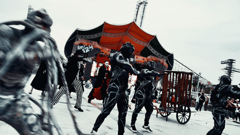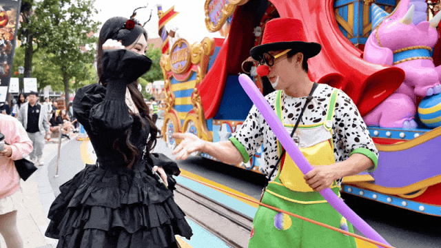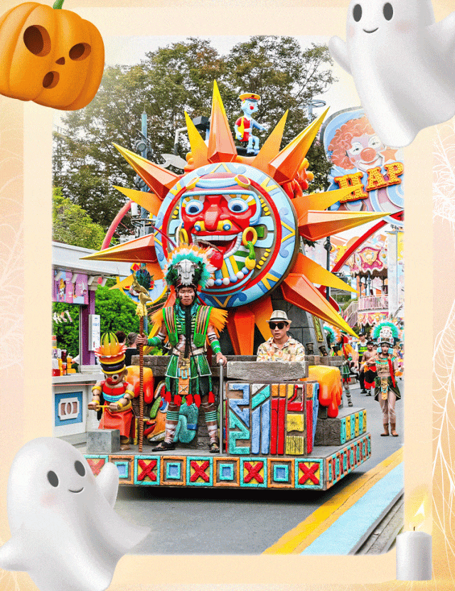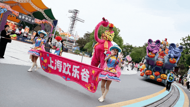 花车周围簇拥着一群穿着华丽服饰的舞者