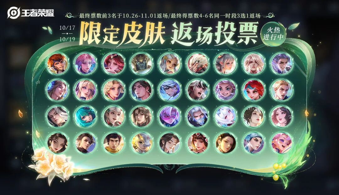 本次活动期间,玩家可通过完成每日任务获取投票券为喜欢的皮肤争取返场机会;最终票数将于10月20日公示,玩家无法再参与投票。