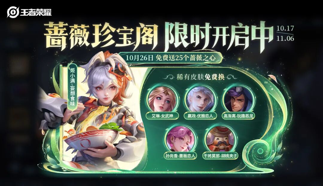 小伙伴在10月26日00:00-10月28日23:59登录,即可领取25个蔷薇之心奖励;蔷薇之心可用于兑换珍宝阁专属皮肤:孙尚香-蔷薇恋人、嬴政-优雅恋人、艾琳-女武神、高渐离-玩趣恶龙、干将莫邪-胡桃夹子、姬小满-妄想食味。