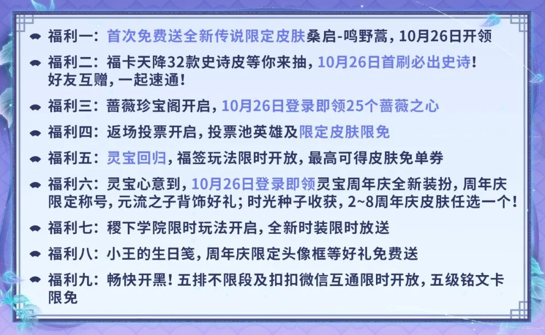 为感谢大家对小王的支持,10月26日小王将通过邮件向大家发送感谢生日笺。领取后可获得周年庆限定头像框,皮肤碎片*5,积分夺宝抵扣券*1,五级铭文卡*1。希望大家玩的开心~