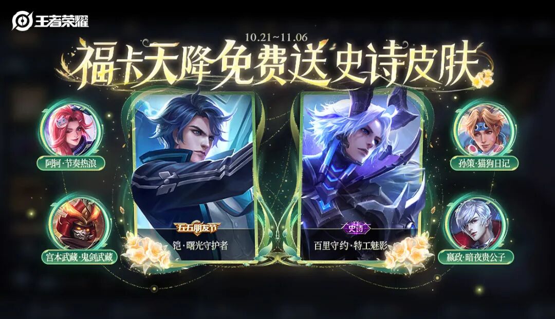 活动期间,玩家完成任务可免费获得福卡钥匙抽取福卡,最高可得史诗皮肤奖励。奖励领取将在10月26日开放,更可与好友互赠福卡,大大提升获得心仪皮肤的概率!