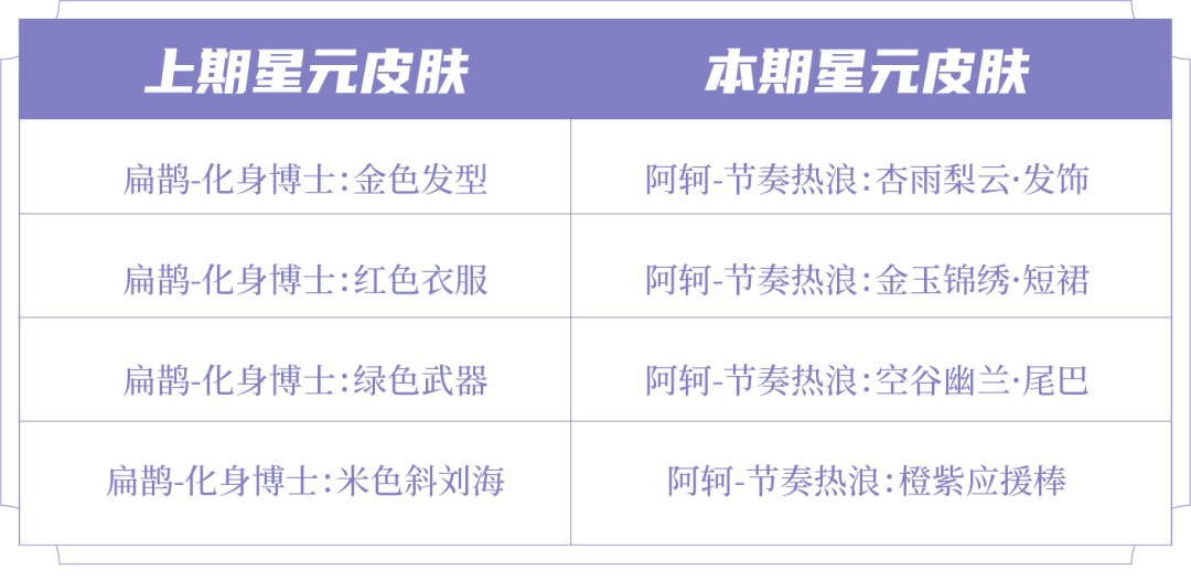 ⋄限免皮肤:哪吒-逐梦之翼,小乔-山海·琳琅生,曜-山海·苍雷引,关羽-百相守梦,安琪拉-追逃游戏,云缨-鹤归松栖,大乔-时之奇旅,裴擒虎-李小龙,杨玉环-遇见飞天,伽罗-天狼溯光者,孙悟空-齐天大圣,项羽-无限倾心,刘备-百相守梦,亚瑟-追逃游戏,赵怀真-鹤归松栖,甄姬-至美·化雀舞,鬼谷子-五谷丰年,上官婉儿-梁祝,不知火舞-绯月行,瑶-山海·碧波行,虞姬-无限倾心,张飞-百相守梦,诸葛亮-鹤羽星尊,李元芳-匿光侦查者,西施-至美·乘鲤谣,庄周-高山流水,阿古朵-江河有灵,墨子-降魔,李信-山海·炽霜斩,夏洛特-浮生妄,沈梦溪-匿光破解者,上官婉儿-妄想奇谈,兰陵王-影龙天霄,周瑜-雪夜绮愿,甄姬-游园惊梦,貂蝉-遇见胡旋。