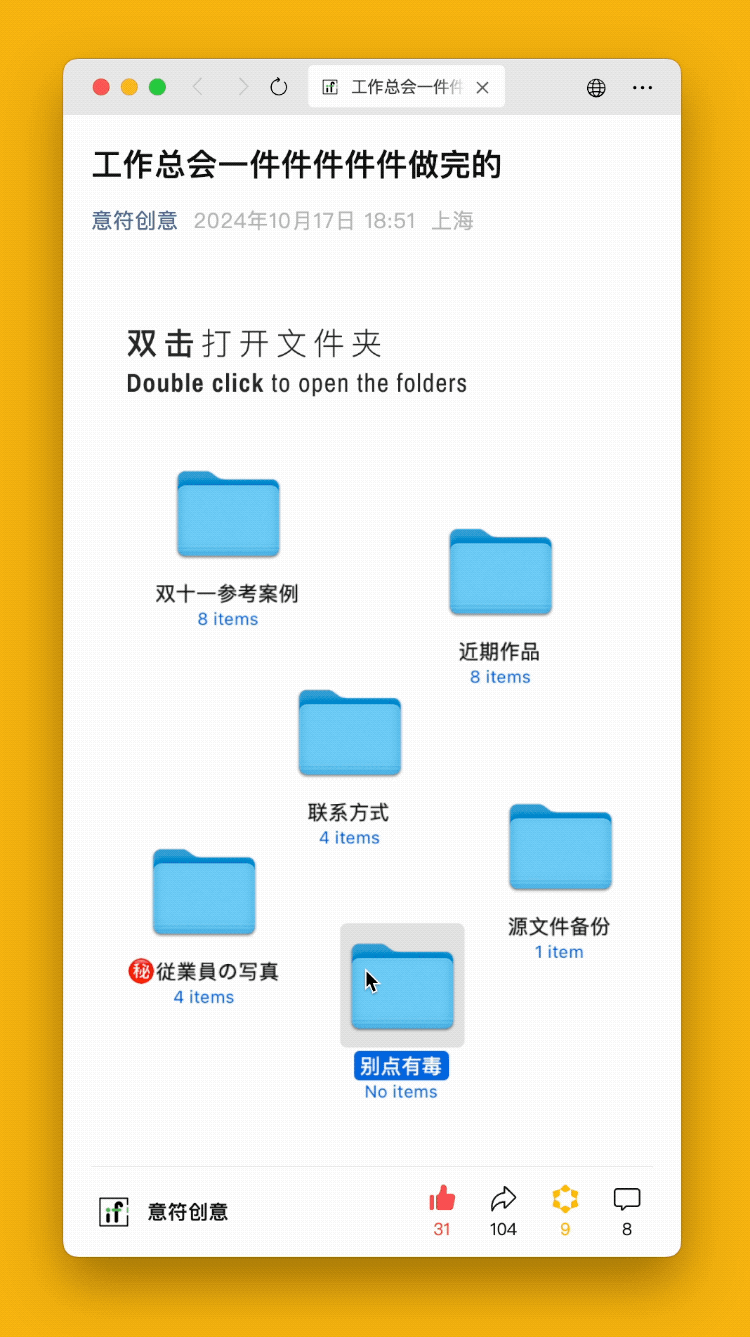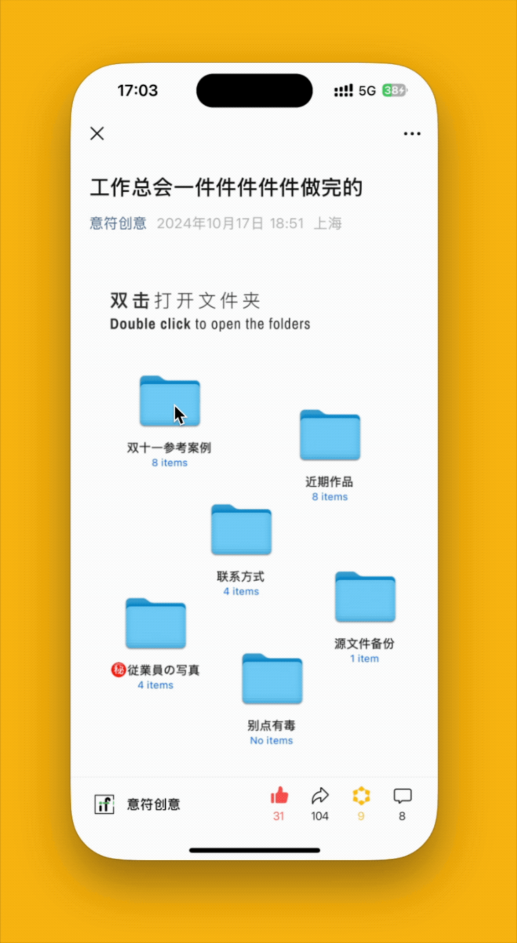 例如本文介绍的拟态文件夹互动,就借助了用户十分熟悉的「双击打开文件夹」的操作场景↓