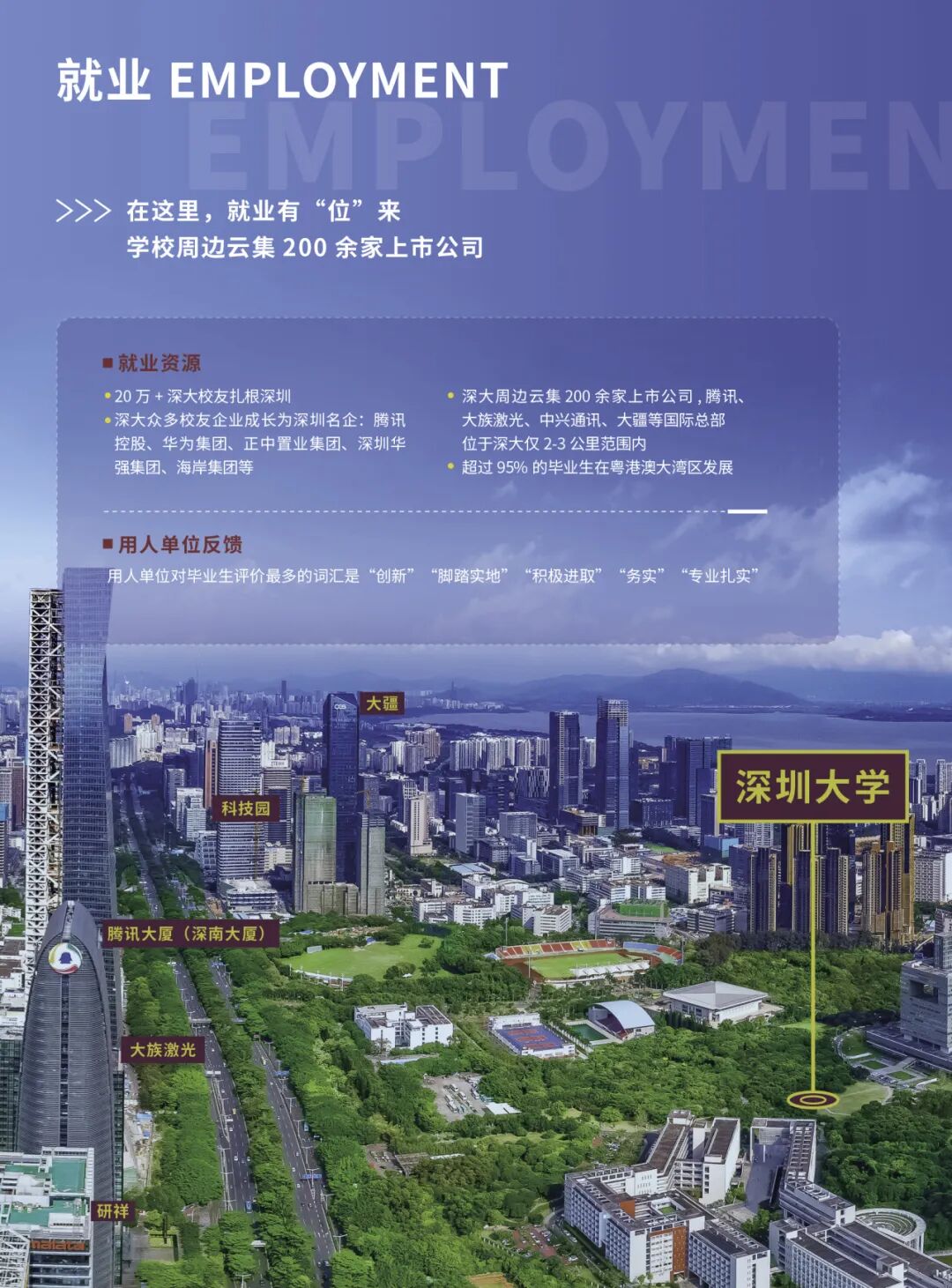 深大约95%毕业生在粤港澳大湾区发展。近年来,录用深大毕业生人数最多的前3个单位分别是:比亚迪股份有限公司、腾讯科技(深圳)有限公司、华为科技有限公司。